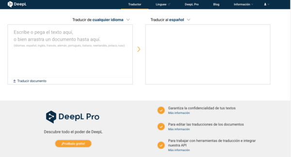 DeppL está especializada en la traducción inglés/castellano, aunque domina más de 40 idiomas. Por otro lado, no requiere de descargas, ni registros. Sólo por eso, ya tiene un puesto entre los mejores traductores que hay en Internet